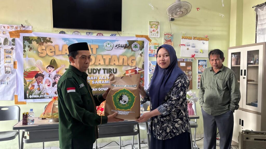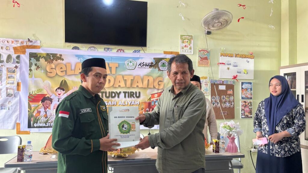 Kepala MA Maarif Askari, menyerahkan cindera mata MA Maarif berupa plakat berbentuk perahu sandeg kepada kepala MA Arifah Ridzan Djafri (Jumat, 23 November 2025) Penyerahan itu dilakukan pada acara penyambutan rombongan tim Studi tiru MA Maarif Sarampu ke MA Arifah Gowa.